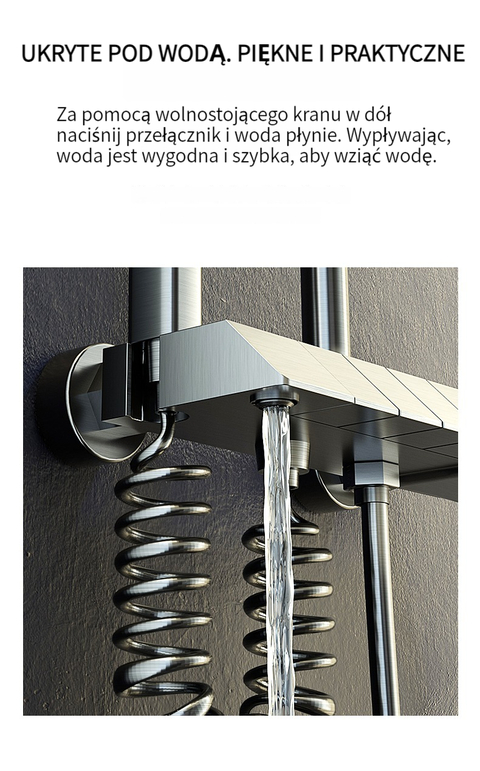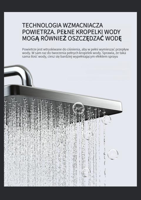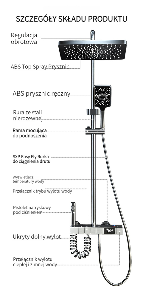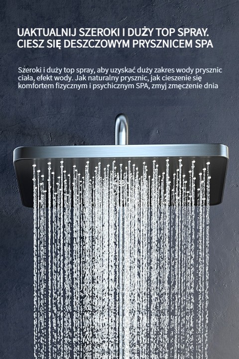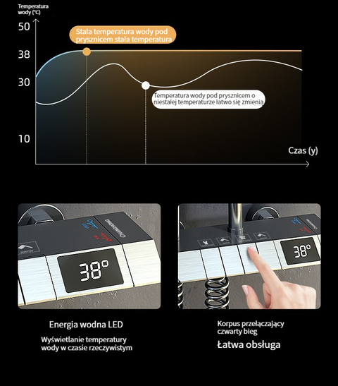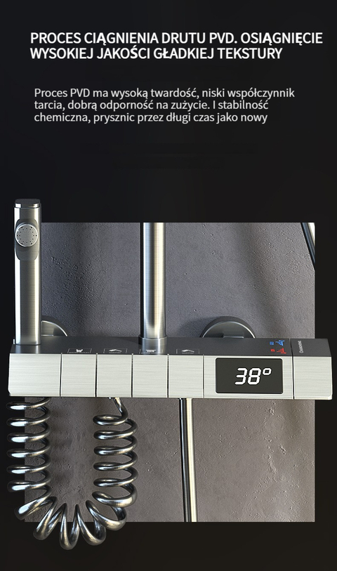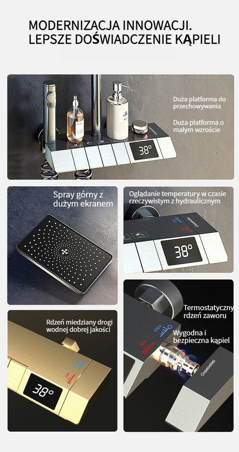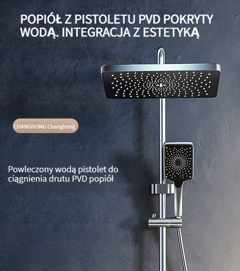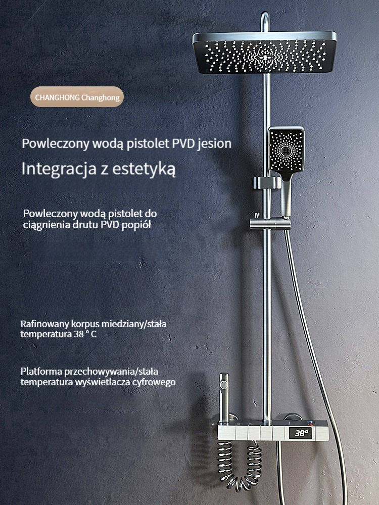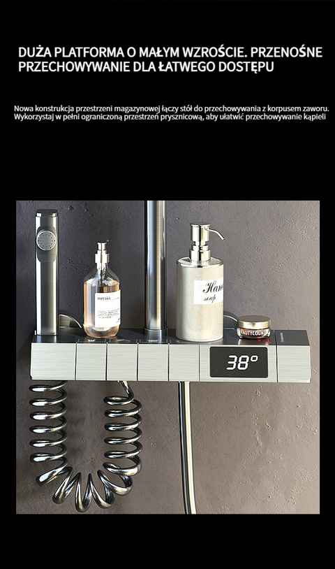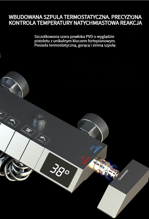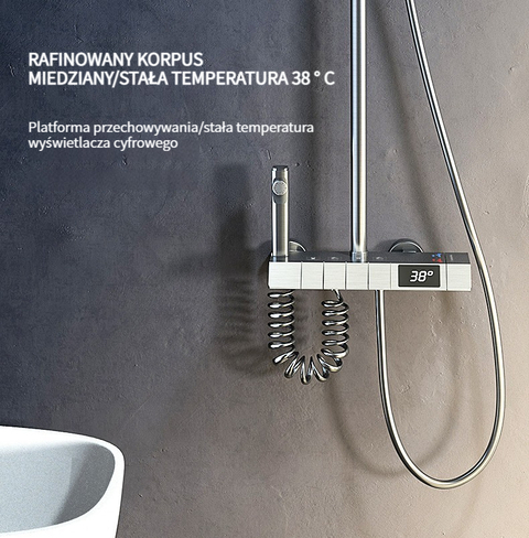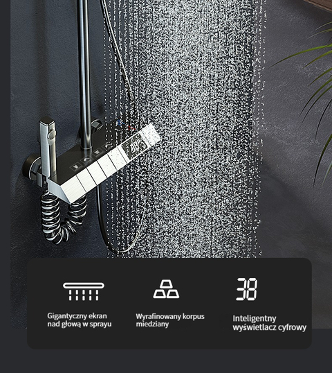 Zestaw prysznicowy z klawiszami pianina, inteligentnym termostatem i wyświetlaczem cyfrowym.
